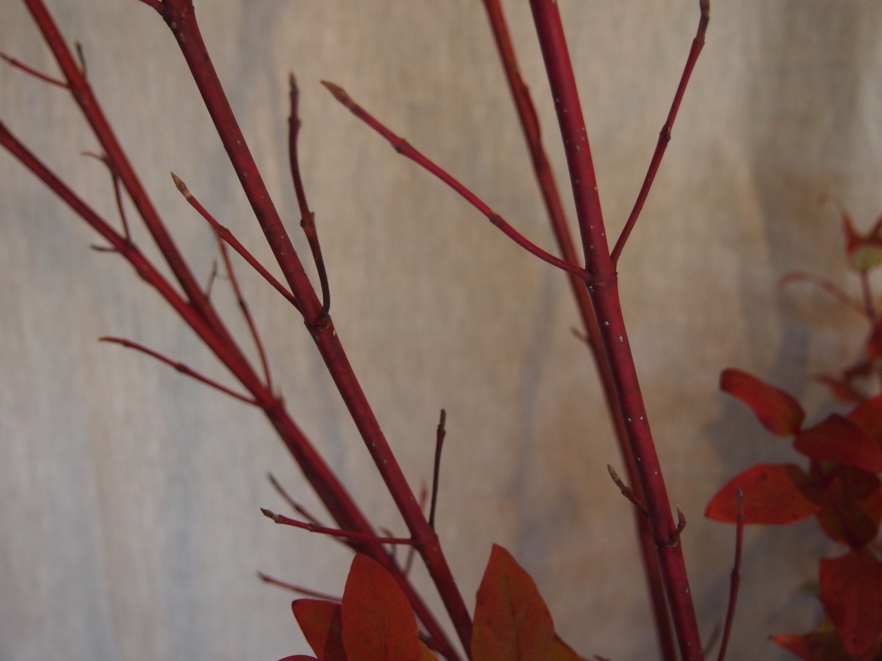 サンゴのような鮮やかな赤色のまっすぐに伸びた枝がシャープな印象を添えます。